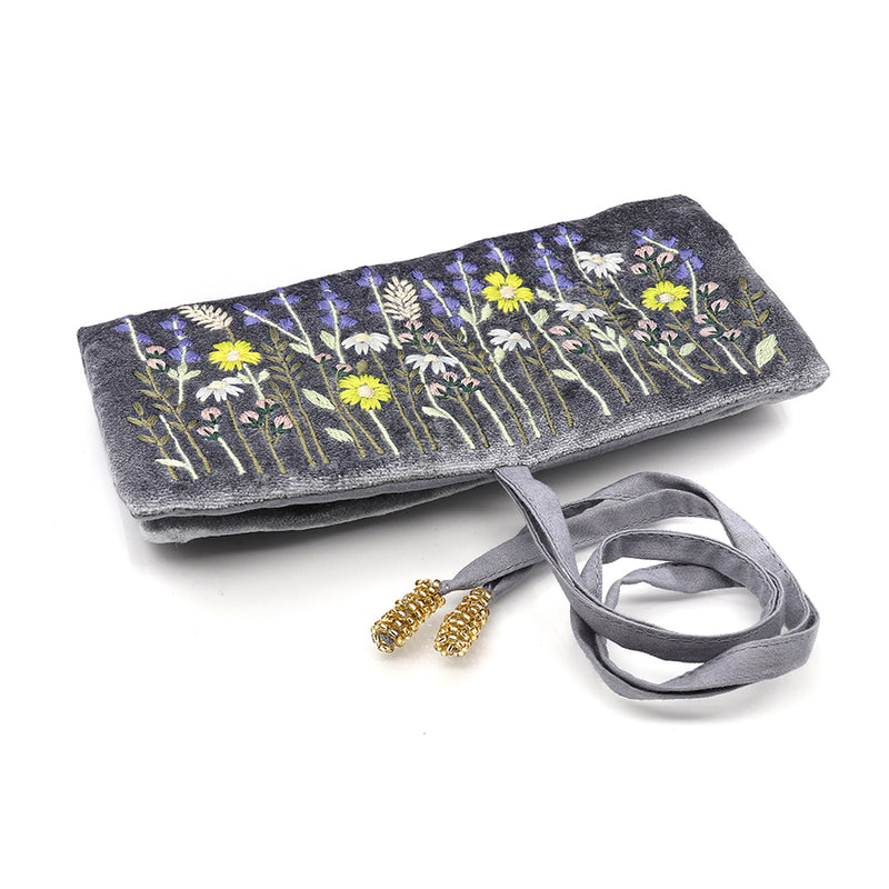 Smoky grey cotton velvet jewellery roll with embroidered lavender meadow