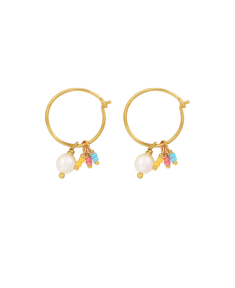 Materials: 18K gold plated sterling silver with 1 micron and e-coating, freshwater pearls and coloured miyuki beads. Hoop diameter: 1.6 cm.